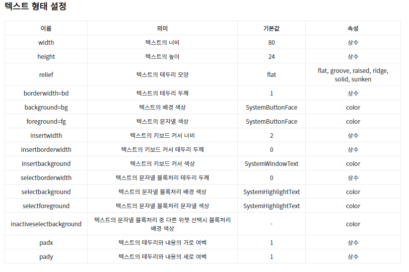 - tkinter.Text(윈도우 창, 파라미터1, 파라미터2, 파라미터3, ...)을 사용하여 해당 윈도우 창에 표시할 텍스트의 속성을 설정할 수 있습니다.