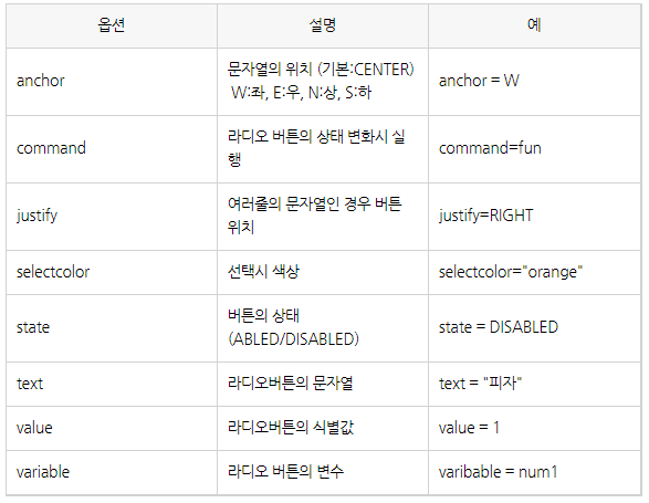 | 변수 = Radiobutton(부모객체, 옵션) |