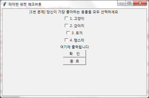 label1 = Label(win, text = "[1번 문제] 당신이 가장 좋아하는 동물을 모두 선택하세요 ")