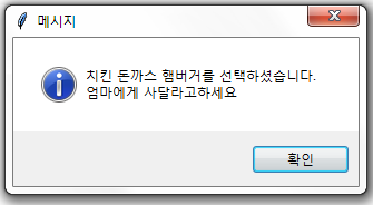 messagebox.showinfo("메시지",str + "를 선택하셨습니다.\n엄마에게 사달라고하세요")