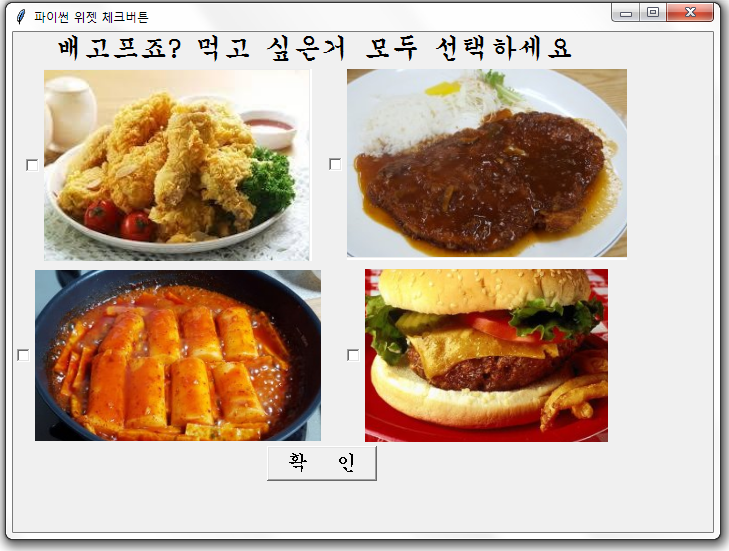 label1 = Label(win, text = "배고프죠? 먹고 싶은거 모두 선택하세요 ", font=("궁서체","20"))