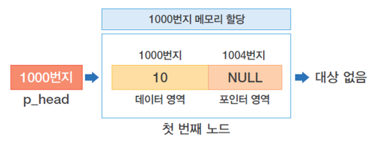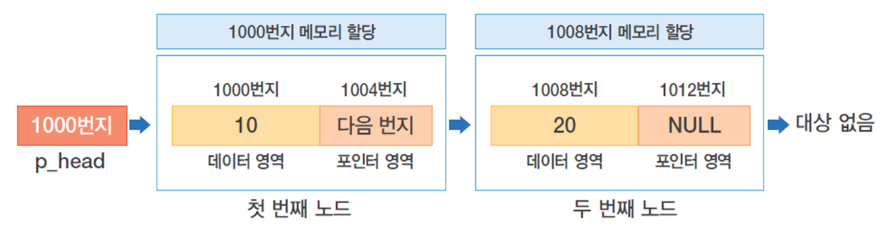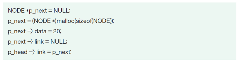- p_next 데이터 필드에는 20을 저장하고 링크 필드에는 NULL 값을 설정한 다음 p_head의 링크 필드에는 p_next를 대입하기