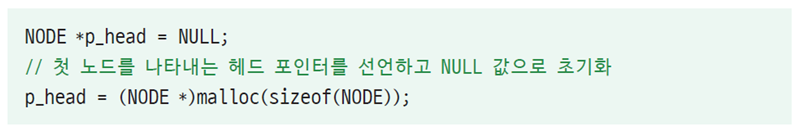 - NODE 타입의 포인터 변수를 선언하고 malloc( ) 함수로 노드의 크기만큼 동적 메모리를 할당받아 사용하려면 다음과 같이 선언합니다.