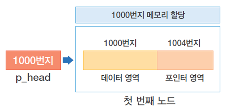 - 동적 메모리가 1000번지에 할당된다고 가정할 때 노드는 다음 그림과 같이 생성됩니다.