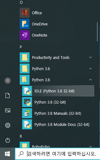 파이썬 프로그램 설치가 완료되면 여러분들 컴퓨터 [시작]메뉴에서 [Python 3.8] - [IDLE(Python 3.8 32-bit)] 를 실행시킵니다.