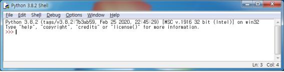 프롬프트라 불리는 >>>에 코드를 한 줄 한 줄 입력하면 곧바로 실행결과를 볼 수 있습니다. ‘ 인터렉티브 셸’ 이라고 부르며, 추가로 한 마디씩 주고 받는 것처럼 대화한다고 해서 ‘ 대화형 셸’이라고 부르기도 합니다.