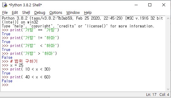 파이썬은 문자열에도 비교 연산자를 적용할 수있습니다. 이때 한글은 사전순(가나다라)fh 앞에 있는 것이 작은 값을 갖습니다. 예를 들어 ‘가방’과 ‘하마’를 비교하면 사전 순서로 '가방‘이 앞에 있으므로 ’가방‘이 ’하마‘보다 작은 값습 갖습니다 다음 코드를 통해 결과를 살펴보겠습니다.