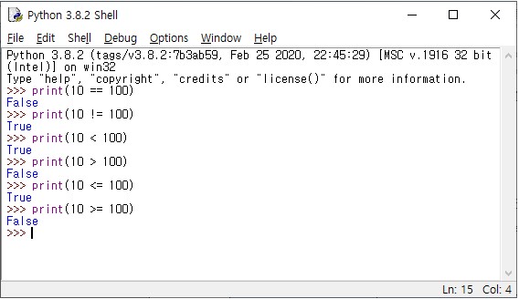 비교 연산자는 숫자 또는 문자열에 적용할 수 있습니다. 숫자의 대소 비교는 누구나 쉽게 할 수 있습니다. 다음과 같은 코드를 실행시키면서 결과를 살펴보겠습니다.