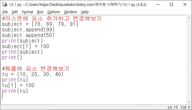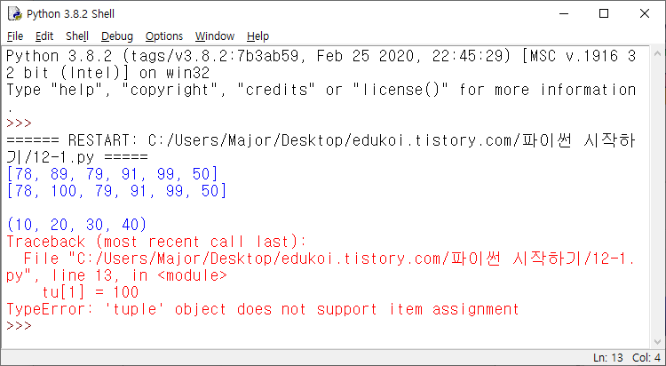 ※ 실행 중에 요소를 추가하거나(뒤에서 점수를 배열에 추가) 요소의 값으 수정하거나 할 수 있는 것은 리스트뿐입니다. 튜플은 생성 후에 값을 변경할 수 없습니다.
