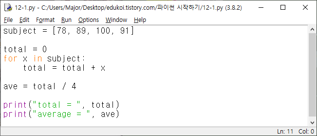 [예제] 4개의 과목 점수를 리스트에 저장해서 총점과 평균을 구해봅시다.