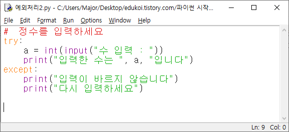 - 정수를 입력받고 싶습니다. 만약 정수를 입력하지 않으면(문자나 특수문자등이 입력되면) else 구분 쪽이 실행되서 '입력이 바르지 않았습니다'라는 문자열을 출력하게 됩니다.
