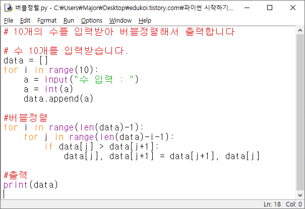 | 리스트 안에서 두 자료 값의 위치를 서로 바꾸는 데 다음과 같은 문장이 사용되었습니다. data[i], data[j] = data[j], data[i] 파이썬에서 두 변수의 값을 서로 바꾸려면 다음과 같이 쉼표를 이용해 변수를 뒤집어 표현하면 됩니다. x, y = y, x |