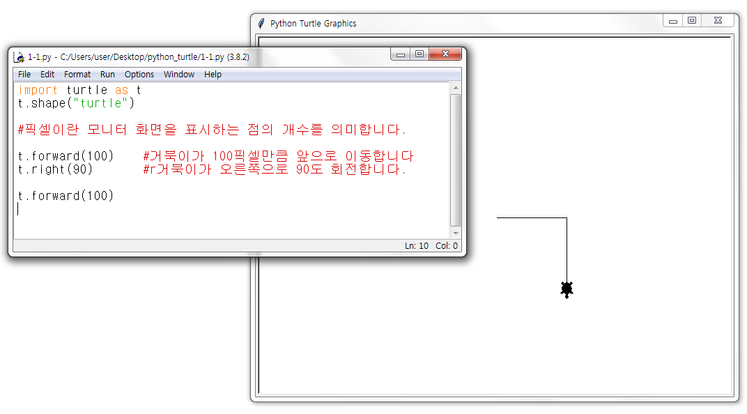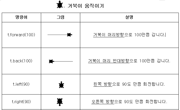 2. 거북이에게 명령을 내리면 거북이는 명령에 따라 종이(거북이 그래픽 창) 위를 움직입니다. "앞으로 이동! 왼쪽으로 꺽어! 오른쪽으로 이동!"과 같은 명령을 떠올리면 이해하기 쉽습니다.