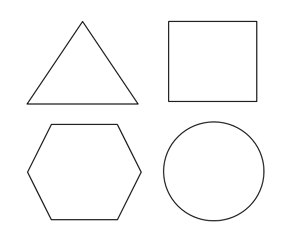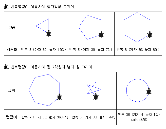 [연습1] 다음과 같이 거북이를 움직여 삼각형, 사각형, 오각형, 육각형을 만들어 보세요